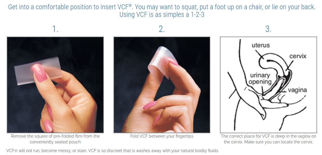 The instructions for the VCF® Film state that the film should be placed over the cervix. You want to make sure that you are inserting the film as high up into your vagina as possible without causing discomfort. Once inside the vagina, the film will dissolve to form a gel type substance so even if the film isn’t exactly in place over the cervix, the whole area is protected once the film dissolves.